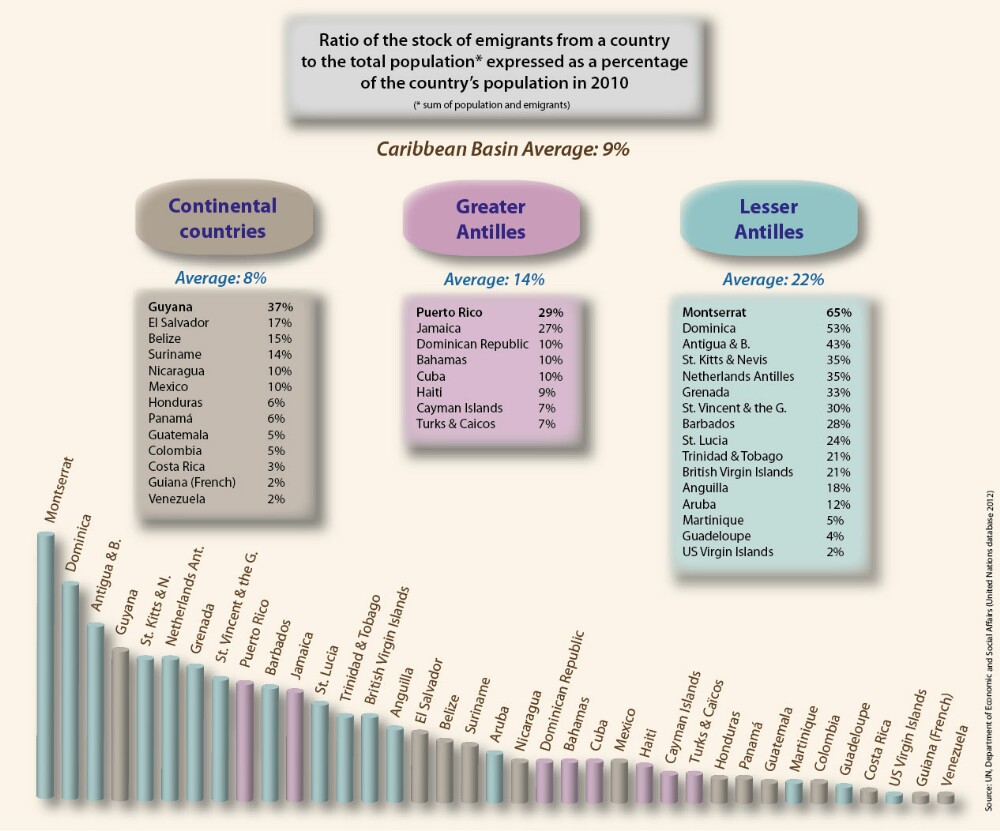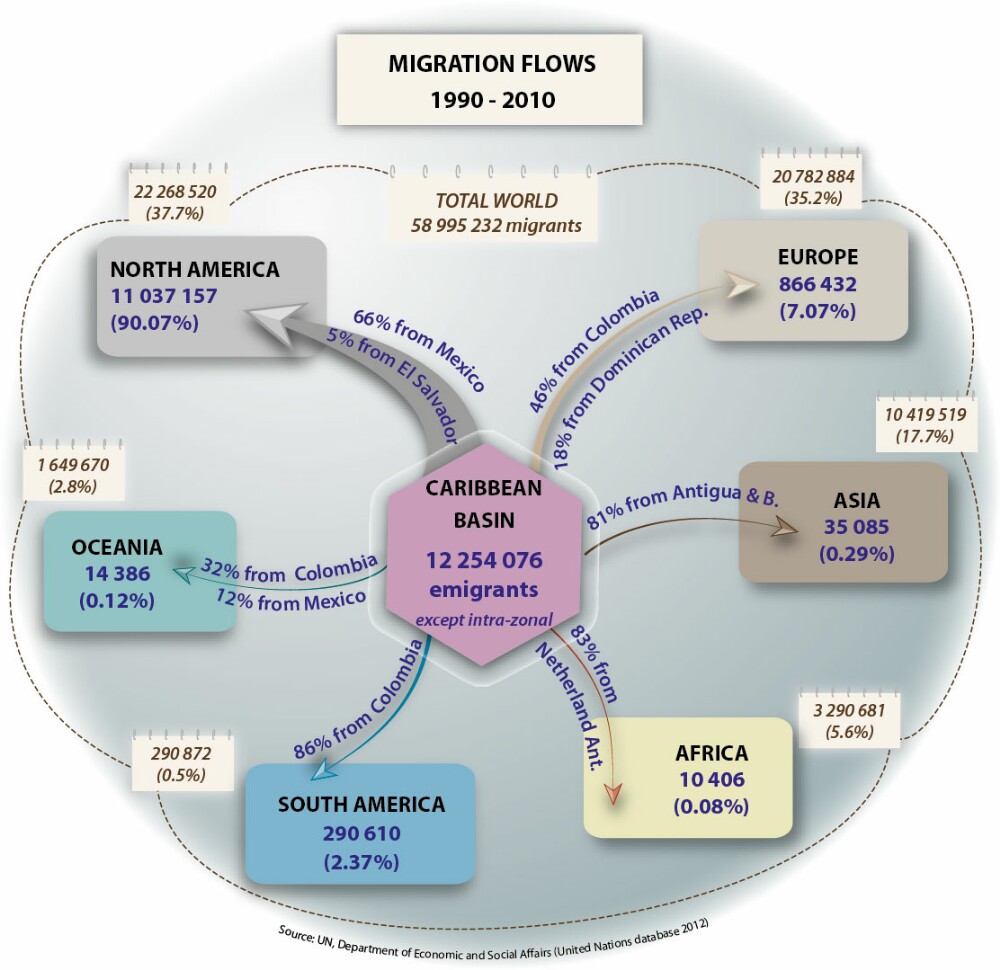 Over the last twenty years, another pattern of migrations has become all too obvious to give the contemporary model. Europe does not have any more the place which it had during the previous time (1960-1990), North America saw his increasing considerably. The emigration towards other areas of the world constitute the main part of flows, but in the Caribbean Basin the intraregional movements still prevail, even in certain cases are reinforced. In mass, excluding Mexico which crushes the statistics, the countries of the isthmus, Colombia, and the Greater Antilles constitute the man flows towards North America. Compared to the country’s population, there are strong differences in the archipelago: less than 12% in Dominican Republic or Haiti, more than 70% in Antigua-and-Barbuda, 110% in Dominica, and more than 180% in Montserrat.