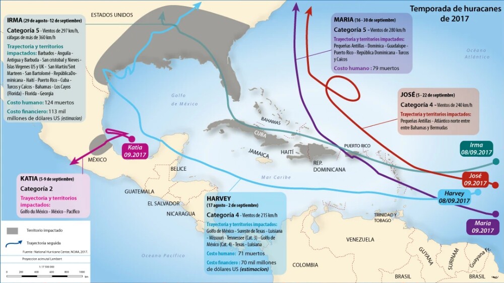 La serie de tormentas tropicales ascendidas a la categoría de huracán desde el principio de la temporada de huracanes 2017 y los dos terremotos de gran magnitud que se produjeron en México, aportaron su cuota de destrucciones, devastaciones y víctimas en una gran parte de la cuenca del Caribe. Este año, desde las pequeñas Antillas hasta México, Texas y Florida, pasando por las grandes islas del norte del archipiélago, el número de ciclones que subieron a categoría 5, incluyendo Harvey, Irma, Katia, José, María, es importante , antes de que sea el fin de la temporada.