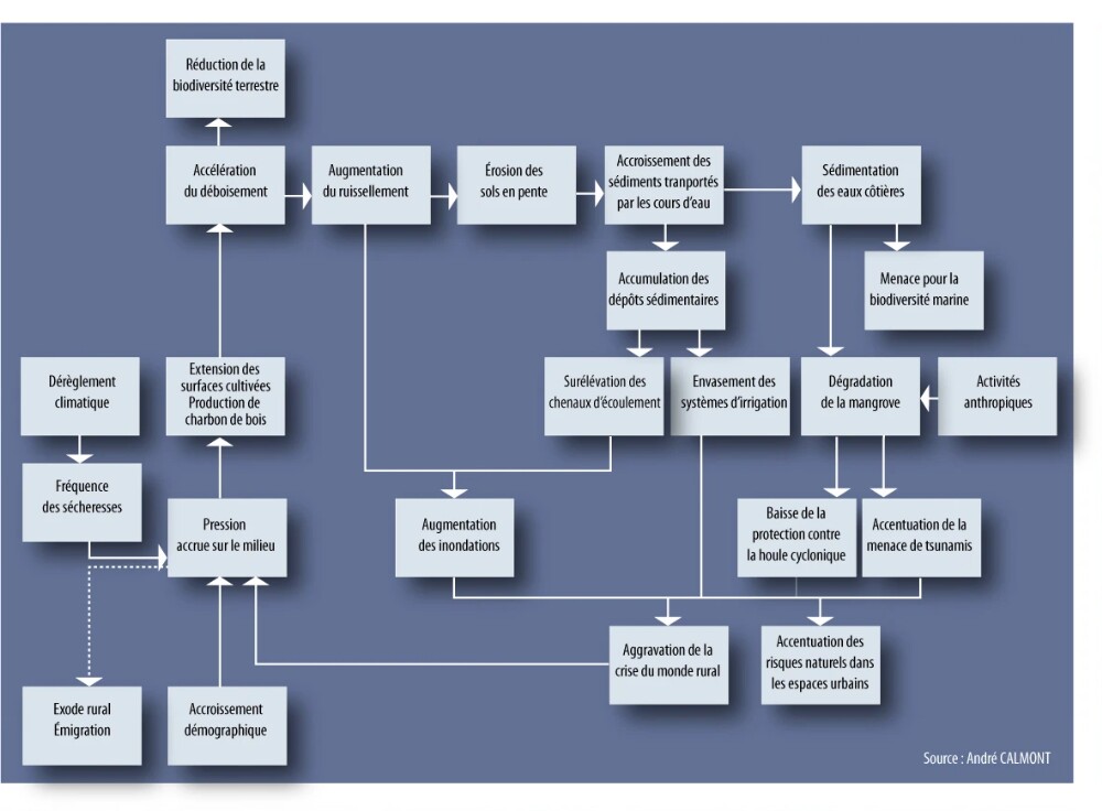 Les effets du déboisement sur le territoire haïtien constituent un engrenage systémique. En effet, au cours de son histoire, la paysannerie haïtienne avait su développer des méthodes et des techniques de culture adaptées à l’agriculture de montagne, avec un système agroforestier dense où l’ensemble des strates était exploité. Mais par la suite, les surfaces caféières ont largement diminué au profit de l’agriculture vivrière. En parallèle, la pression démographique a doublé depuis les années 1980 : même les terres les plus pentues sont valorisées par une agriculture vivrière de survie, sans structures anti-érosives, l’arbre ayant perdu petit à petit sa place dans l’exploitation agricole haïtienne. La disparition de la couverture arborée a entraîné une grave crise environnementale. L’érosion provoque un appauvrissement des terres mises en culture et les rendements agricoles diminuent, fragilisant encore plus les familles paysannes, entraînées dans la spirale de la vulnérabilité : baisse des rendements, baisse des revenus, coupe des arbres et vente de charbon, augmentation de l’érosion, baisse des rendements, etc. Le cycle de l’eau est complètement perturbé : l’infiltration est minimale, le ruissellement maximal ; le niveau des crues est anormalement élevé, provoquant des dégâts matériels et des pertes humaines considérables.