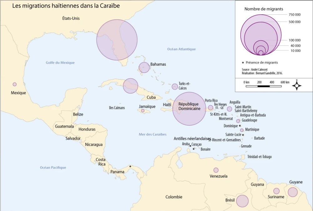 Les flux successifs ont élargi et diversifié l’espace migratoire des Haïtiens, révélant à la fois leur volonté de fuir leurs conditions de vie difficiles, l’efficacité des réseaux et l’attraction des destinations au haut niveau de vie. La présence haïtienne à l’étranger reste difficile à évaluer, du fait de l’importance des clandestins, des naturalisés et du nombre d’enfants de la seconde génération. Elle est estimée entre 1,5 million et 2 millions de personnes, regroupée en deux pôles principaux : la grande Caraïbe et l’Amérique du Nord. Environ 750 000 ont émigré vers les pays caribéens voisins, dont un demi-million en République Dominicaine . Les autres sont dispersés dans une vingtaine de territoires (Bahamas, Turks-et-Caïcos, Cuba, Porto Rico, Antilles et Guyane françaises, Antilles néerlandaises, Venezuela, Surinam). L’Amérique du Nord accueille un nombre de migrants encore plus important, en particulier les États-Unis (la moitié de la diaspora, soit 800 à 850 000 personnes), essentiellement dans la région de New York et en Floride ; le Canada en accueille près de 100 000 (et le double en comptant la seconde génération), localisés à 90 % dans la province de Québec (Montréal). Les Haïtiens en Europe occidentale résident presque exclusivement en France (près de 100 000 personnes), mais il existe de petites communautés en Belgique, en Suisse et aux Pays-Bas. On note aussi une présence récente et croissante en Amérique du Sud (Brésil).