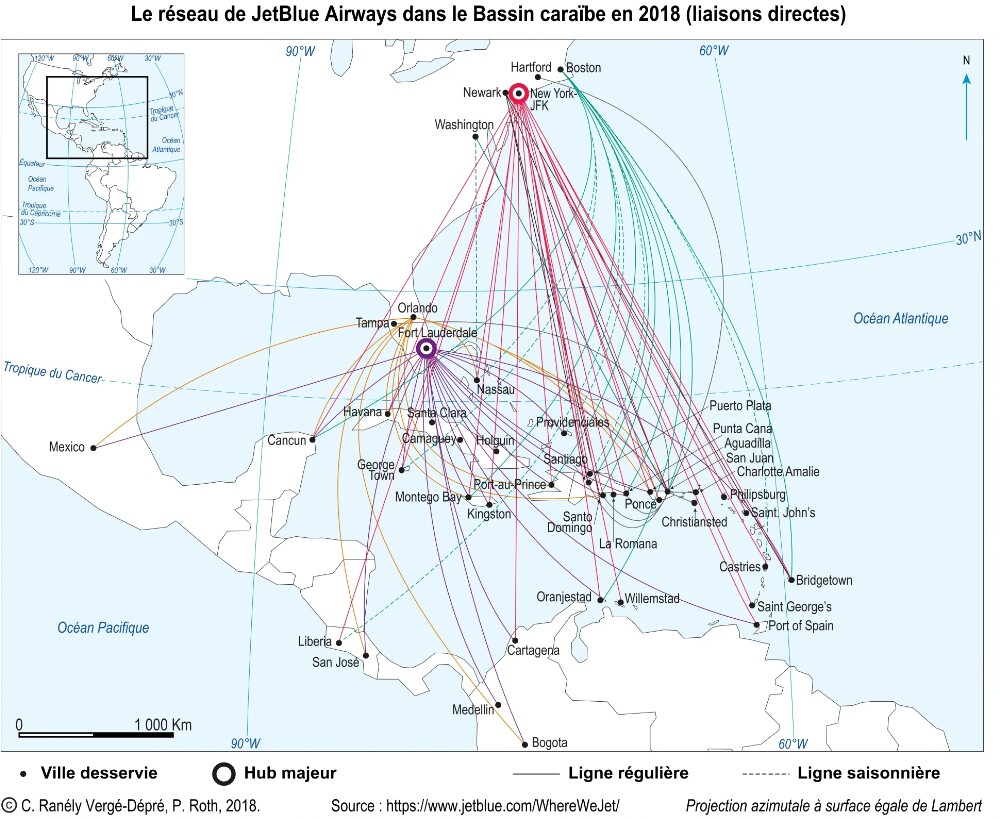 La stratégie de ces compagnies influence aussi beaucoup la vie aérienne régionale. Les choix qu’elles opèrent dans la localisation de leurs hubs et dans les destinations qu’elles desservent peuvent avoir de lourdes conséquences. Ainsi, le recul marqué du trafic de San Juan reflète certes, en partie, les graves difficultés économiques de Puerto Rico, mais est aussi la conséquence du départ d’American Eagle, dont San Juan était depuis 1984 le hub unique aux Antilles. Concurrencée par d’autres transporteurs américains depuis leurs bases continentales, elle a quitté San Juan en 2013, sa maison mère American Airlines ayant redéployé son réseau caraïbe à partir de Miami. La politique menée depuis 2002 par Jetblue a aussi mis à mal son activité. Le réseau dense de lignes directes que cette compagnie a construit dans la Caraïbe depuis ses hubs de New York JFK et de Fort Lauderdale (Fig. 4) a réduit le rôle des hubs régionaux. Jetblue dessert, en 2018, 20 îles (dont Cuba depuis 2016), le Mexique, le Costa Rica et la Colombie. Elle est devenue le principal transporteur desservant Puerto Rico, la République Dominicaine et propose aussi diverses liaisons inter-îles (Jetblue Airways Corporation, 2017).