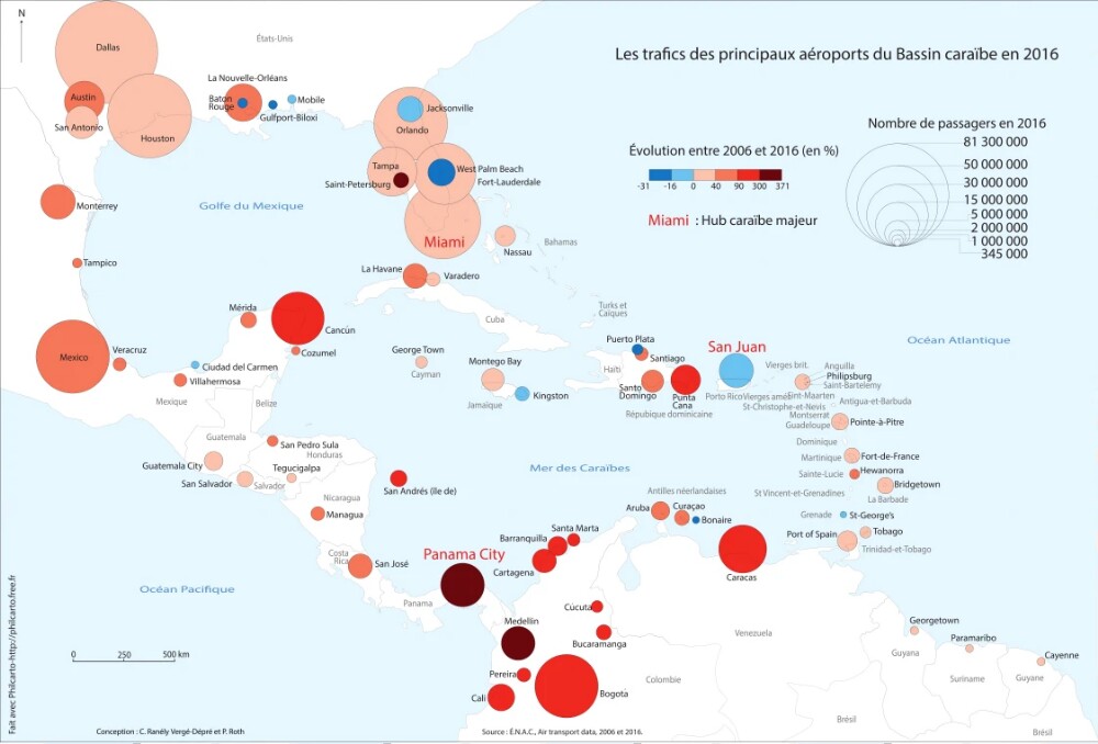 Le bassin compte une myriade d'aéroports qui se différencient par l’importance de leurs trafics, leur rôle organisateur régional, leurs infrastructures , leurs types de clientèles, etc. Cela va du gros hub multimillionnaire en passagers aux minuscules aéroports de certaines îles qui, dans des cas extrêmes, ne sont reliés qu'à une île principale (Tobago, Barbuda, Nevis, etc.). En 2016, à l'échelle de la Grande Caraïbe, une cinquantaine d'entre eux ont enregistré un trafic de plus d’un million de passagers (Fig. 6). Les plates-formes du sud des États-Unis et des trois grands États continentaux (Mexique, Colombie, Venezuela) sont les plus fréquentées, mais, à l'exception de Miami, leurs réseaux sont peu tournés vers la Caraïbe.
