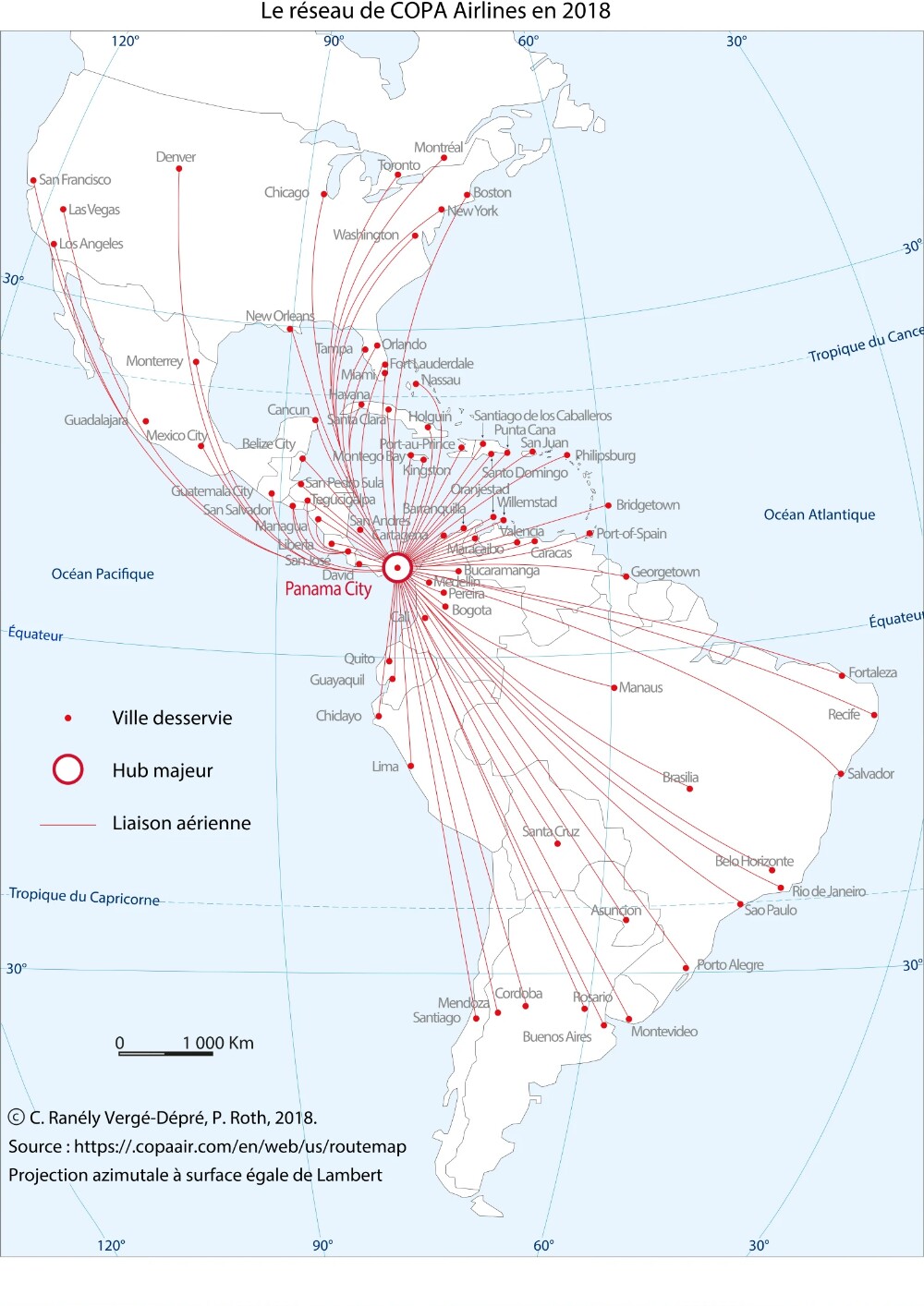 Dans ce contexte difficile, l’histoire, souvent tourmentée, des compagnies régionales, est faite de nationalisations, de privatisations, de fusions et de faillites. Ainsi, Aeronaves de México, sera dès 1934 absorbée par la Pan Am, puis nationalisée en 1959, pour devenir en 1972 Aeroméxico. L’histoire de la COPA (Compañia Panameña de Aviación) compte aussi parmi les plus chaotiques. Fondée en 1947 par des investisseurs panaméens avec une participation de Pan American Airways, elle concluten 1992 une alliance stratégique avec TACA Airlines (devenue depuis Avianca El Salvador). En 1998, Continental Airlines acquiert 49 % du capital puis devient majoritaire l’année suivante avant de réduire progressivement sa participation (10 % en 2006). La compagnie a donc su se dégager de l’emprise étrangère et (re)devenir le transporteur national du Panama. Elle a réalisé en 2016 71 % du trafic de passagers de l'aéroport de Tocumen (Panama City) et est un des fers de lance du dynamisme actuel du Panama. Membre de l'alliance mondiale Star Alliance, elle mène méthodiquement depuis plus d’une décennie, une politique d’extension rapide de son réseau (Fig. 5). La priorité reste aux liaisons méridiennes entre les trois Amériques continentales mais, récemment, elle a sensiblement étoffé ses liaisons avec les Grandes Antilles. Elle dessert en 2018 près de 80 destinations et domine tout l’isthme. Dans le contexte instable du secteur aérien régional, la COPA est devenue la première compagnie régionale et apparaît comme une remarquable success story.