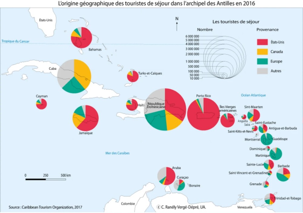 En 2016, les pays de l'AEC ont reçu 75,7 millions de touristes internationaux (UNWTO, 2017). La première destination est le Mexique (34,9 millions), suivie des îles antillaises (25,2 millions), des pays de l'isthme (10,7 millions) et de la bordure sud-américaine de l'AEC (4,8 millions). La proximité des États-Unis, aujourd'hui deuxième foyer mondial émetteur de touristes, après la Chine, explique leur prépondérance. Aux Antilles, ce marché fournit plus de la moitié de la clientèle touristique (Fig. 3) et oriente l'offre des dessertes aériennes. Il représente de 80 à 90 % des touristes aux Bahamas et dans les territoires sous tutelle américaine comme Puerto Rico et les îles Vierges. Cette présence est cependant moins marquée dans les îles du sud de l'archipel, en raison d’un plus grand éloignement et d'affinités culturelles plus fortes avec l'Europe.