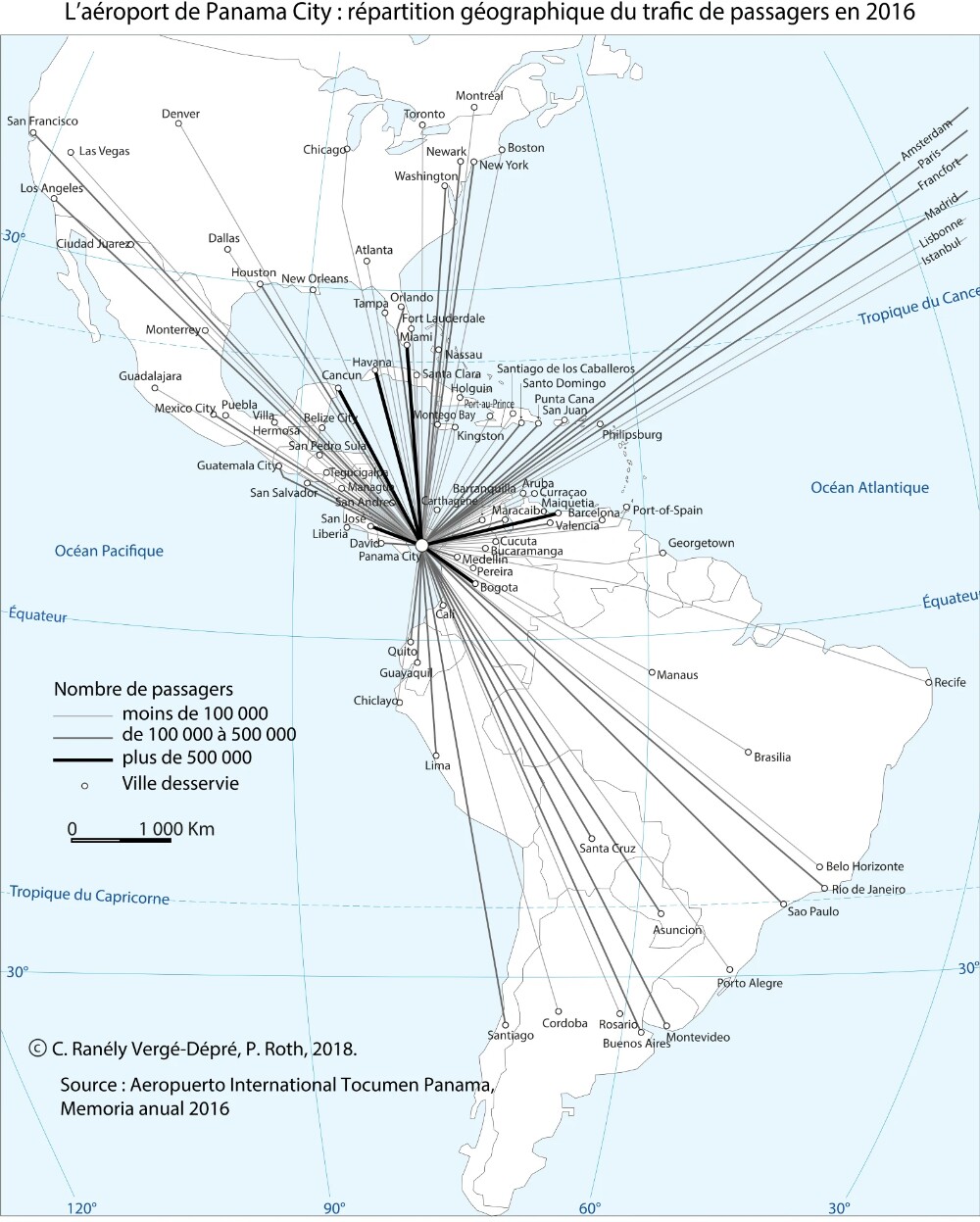 Les réseaux des aéroports montrent deux grandes constantes : d'abord, l'écrasante suprématie, en volume de trafic, des liaisons extrarégionales sur les liaisons internes ; ensuite, l'orientation de ces réseaux vers l'Amérique du Nord et l'Europe (Ranély Vergé-Dépré et Roth, 2015). La proximité géographique et les héritages historiques expliquent ces tendances fortes.