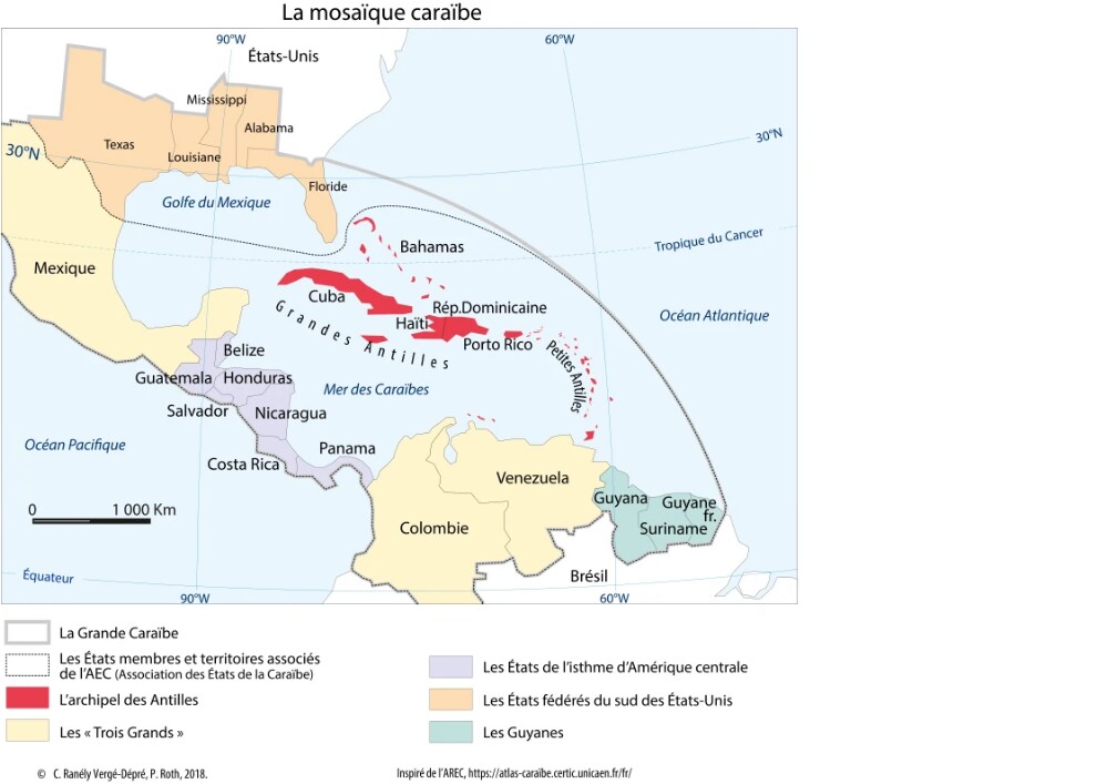 Malgré une apparente évidence cartographique, la Caraïbe est un espace difficile à cerner tant son périmètre peut varier selon les approches géographiques, historiques, géopolitiques ou culturelles (Fig. 1). Pour les caribéens francophones, elle se limite généralement à l’archipel des Antilles. Les anglophones y adjoignent les trois Guyanes et le Belize, territoires qui partagent les héritages de la colonisation européenne et de l'esclavage (Williams, 1970). Les hispaniques la perçoivent comme l'ensemble des pays insulaires et continentaux qui bordent la mer Caraïbe. Une définition géographique plus large l'étend aussi aux terres qui enserrent le Golfe du Mexique, donc aux rivages mexicains et du sud des États-Unis (Mappemonde, n°72, 2003-4). Avec la naissance en 1994 de l’Association des États de la Caraïbe (AEC), les Caribéens sont parvenus à s'entendre pour définir et délimiter leur espace régional en y ajoutant le Salvador et les Bahamas (par proximité géographique) et les trois Guyanes (pour des raisons historiques). Les États-Unis, en revanche, en ont été tenus à l’écart, car ils restent davantage perçus comme la puissance dominante que comme un partenaire partageant les mêmes problèmes et intérêts (Bégot et al., 2009). Ils sont pourtant bien présents physiquement par les littoraux de cinq de leurs États, par leur influence multiforme et les puissants flux de toute nature qu’ils génèrent au sein de cette « Grande Caraïbe ». Même si nous avons adopté dans ce travail le périmètre territorial de l’AEC, il est donc difficile de les oublier. L'AEC est ainsi la première concrétisation institutionnelle du vieux rêve pancaraïbe, même si elle n’a qu’un rôle consultatif et de concertation (CRPLC, 1996-1997 ; Crusol, 2014).