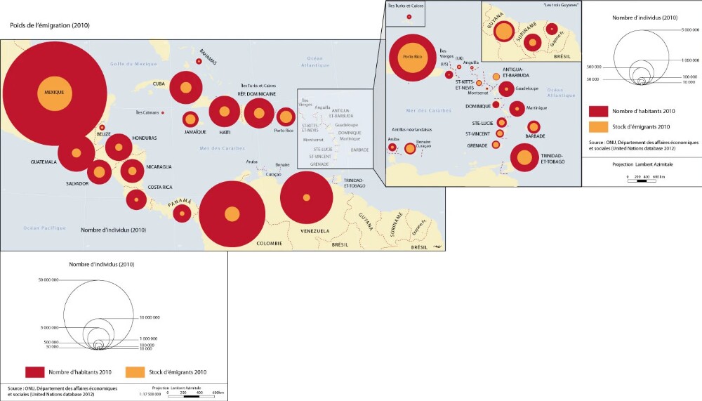 Dans l’espace Caraïbe, les migrants, c'est-à-dire les personnes qui ne sont pas nées dans le pays de résidence s’élevaient en 2010 à 4,2 millions d’individus auxquels on doit ajouter près de 239 000 réfugiés soit au total près de 4,5 millions selon l’ONU (Bureau de la population). D’autres sources de l’ONU, comme le bureau des affaires sociales et économiques, avancent le chiffre de 2,5 millions de migrants dans la Caraïbe. C’est beaucoup et en même temps, peu au regard de l’ensemble de la population de la zone. Les migrants représentent un peu plus de 2% des populations caribéennes avec bien sûr des différences importantes d’une entité à une autre, et sauf exception ces flux ne posent pas de problème majeur.