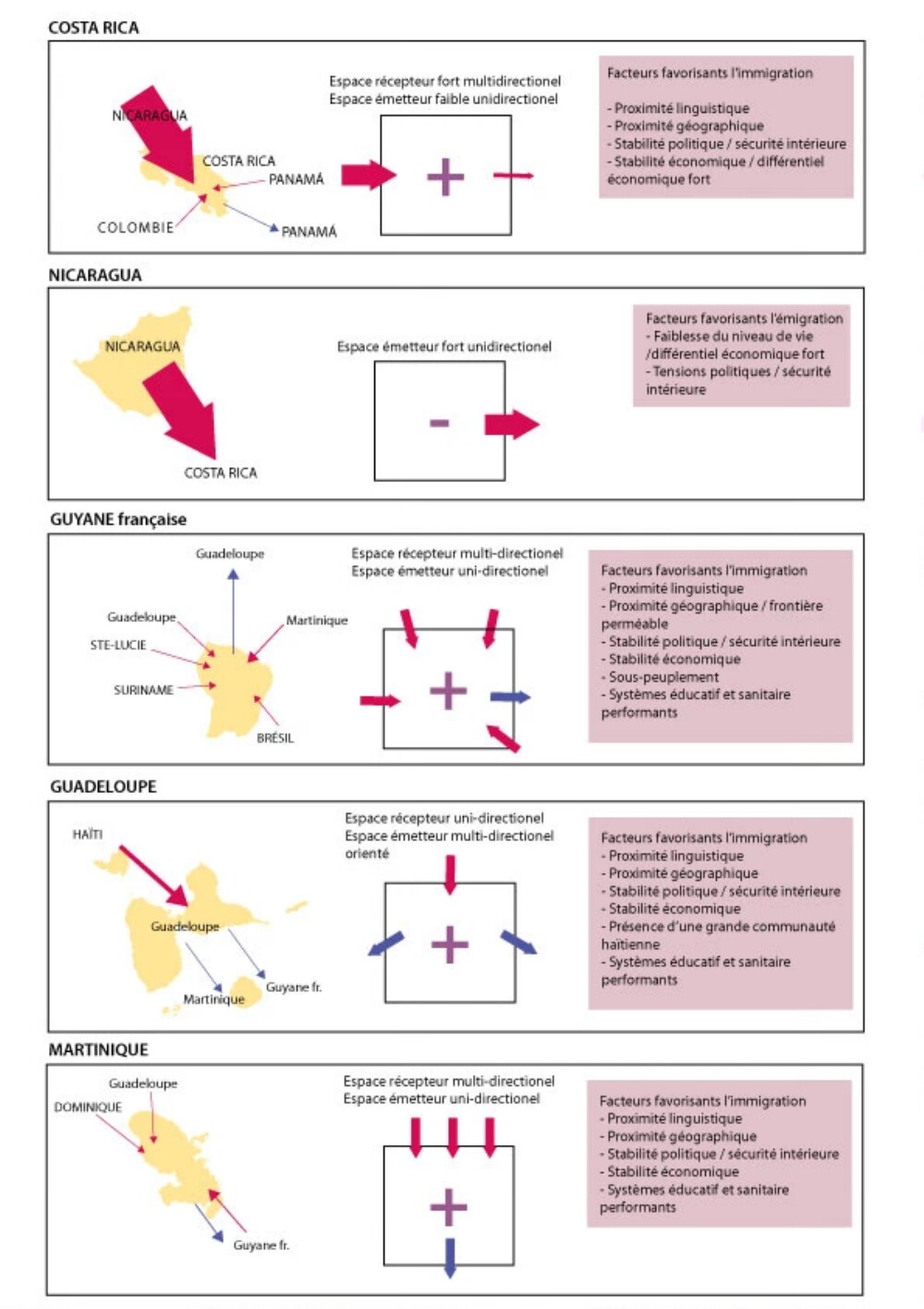 Enfin, autant voire plus que la proximité, ce sont les écarts de richesse entre les entités qui créent ces mouvements de population. Certains pays (Costa Rica), certaines îles constituent des « eldorados » pour les populations de la zone. Le cas des îles encore sous tutelle d’une métropole européenne ou américaine (Martinique, Guadeloupe, Vierges américaines ou néerlandaises, Porto Rico) sont de véritables miroirs aux alouettes. Des revenus élevés, des systèmes éducatifs ou de santé efficaces sont de puissants aimants.
