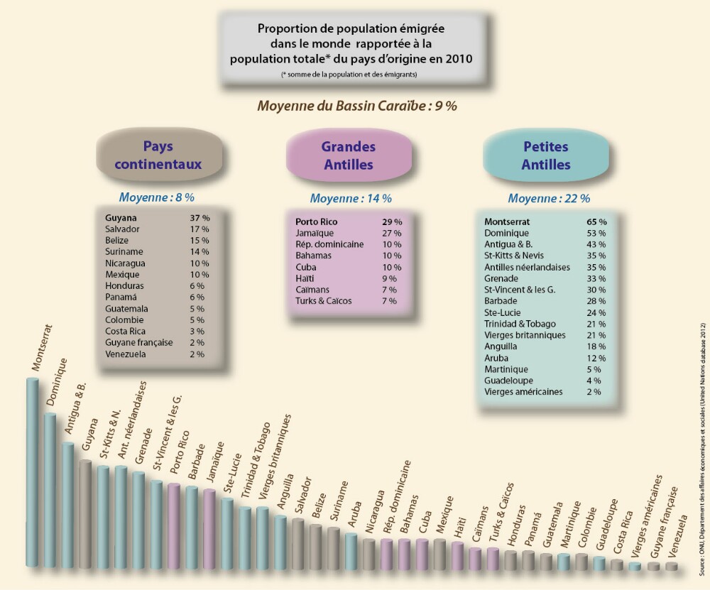 Ces vingt dernières années, un autre modèle de migrations s’est imposé petit à petit pour donner le modèle contemporain. L’Europe n’a plus la place qu’elle avait dans la période précédente (1960-1990), l’Amérique du Nord a vu la sienne considérablement augmenter. Les départs vers l’extérieur constituent toujours l’essentiel des flux, mais les mouvements intra caraïbes perdurent, voire dans certains cas se renforcent. En masse, le Mexique écrase la statistique, hors lui les pays de l’isthme, la Colombie et les Grandes Antilles constituent les principaux flux de l’Amérique du Nord. En proportion par rapport à la population du pays d’origine, il y a de fortes différences dans l’archipel, entre les moins de 12 % de République dominicaine ou d’ Haïti , et les plus de 70 % d’Antigua-et-Barbuda, voire les 110 % de Dominique et 180 % de Montserrat.