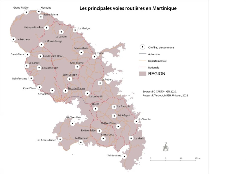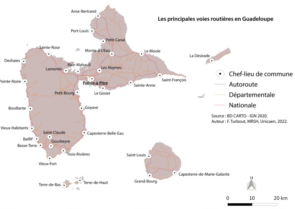Les infrastructures, notamment routières, sont contraintes par ces conditions géomorphologiques particulières et les routes sont souvent sinueuses et abruptes. Elles longent la frange littorale lorsque le relief le permet. Cependant, certaines portions des territoires ne sont pas reliées par des voies de grand gabarit. L’accessibilité de ces zones est donc fortement impactée par les infrastructures à disposition et leur état. Le fort ravinement dû aux intempéries et à la violence de celles-ci rend parfois la circulation périlleuse et impacte notablement les déplacements des habitants. Les voies de communication telle que présentée dans les cartes n°2 et n°2bis permettent de rendre compte de l’accessibilité de certaines parties des îles. Ainsi les grandes voies convergent vers les centres alors qu’à l’inverse, des portions de territoire, particulièrement au nord de la Martinique et à l’ouest de la Guadeloupe, restent dépourvues de voies rapides. Dans le cas de la Guadeloupe, l’organisation en archipel impose d’autres modes de transport, l’avion et le bateau, ce qui complique d’autant plus les déplacements des populations.
