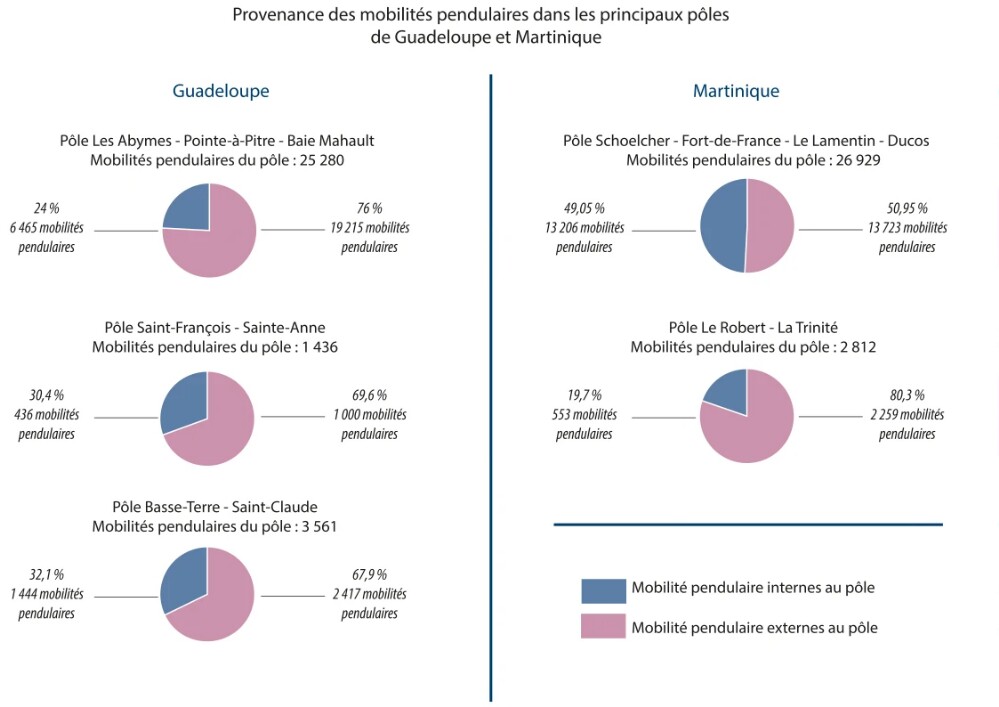 Les logiques de déplacements privilégient en Martinique la proximité ou l’attractivité des grands pôles industriels, commerciaux et touristiques, sans grandes surprises, cette logique animant la majorité des territoires. Plus on s’éloigne de ces pôles d’attraction, plus les déplacements pendulaires se replient sur le proche voisin, voire se pratiquent à l’intérieur même des zones d’emploi. Les distances et l’accessibilité sont déterminantes, mais il faut également y ajouter des considérations économiques tels que le prix du logement et le marché de l’emploi, notamment en terme de secteurs d’activité et de niveau de qualification. Le revers de cette attractivité centralisée est une saturation des réseaux routiers à destination des pôles, notamment vers Fort-de-France et le Lamentin.
